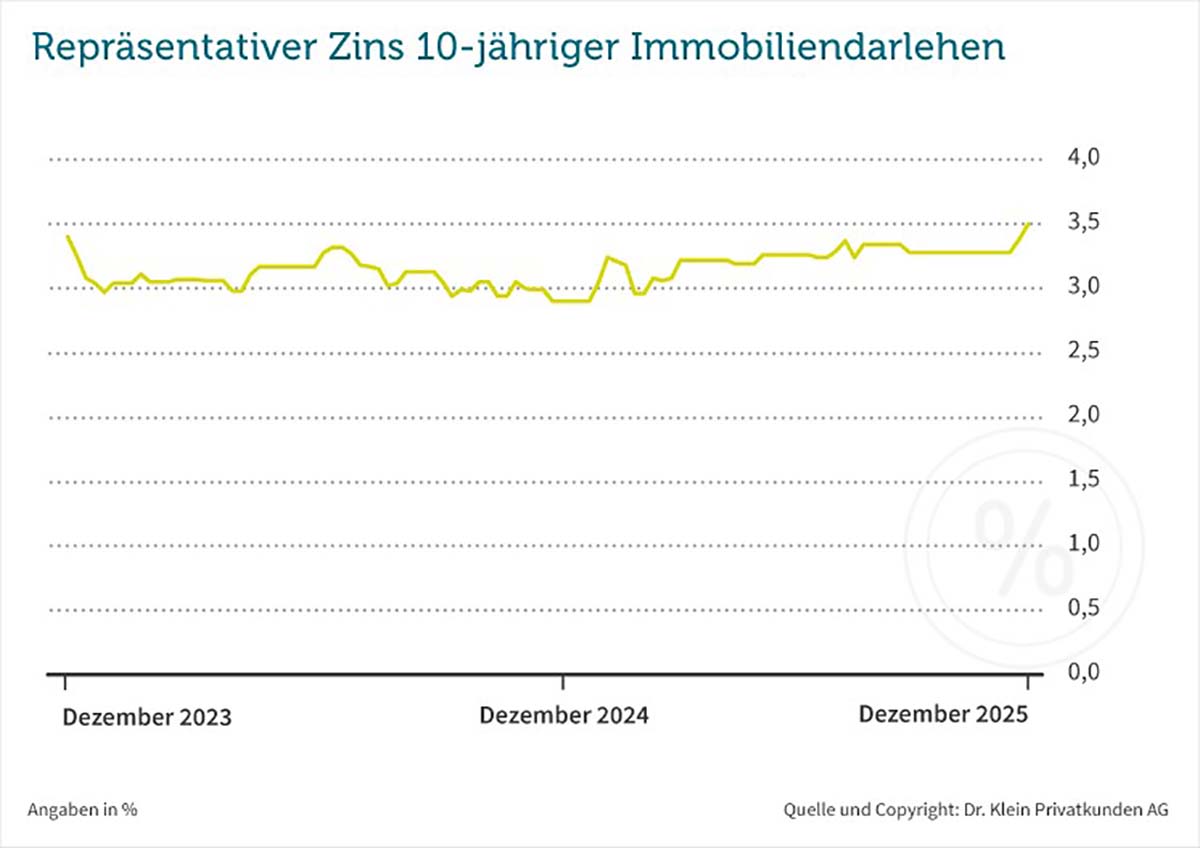 In den vergangenen zwei Wochen orientierten sich die Baufinanzierungszinsen aufwärts – ein kleiner Endspurt in einem Jahr mit weitgehend stabiler Seitwärtsbewegung. Damit laufen die Zinsen 2025 am oberen Ende des von Dr. Klein prognostizierten Korridors von drei bis 3,5 Prozent aus. Gründe für die übers Jahr betrachtet große Konstanz sieht Florian Pfaffinger in einem Zinsumfeld, in dem es keine großen Überraschungen gab: „Im Herbst waren die Wirtschaftsdaten recht stabil. Die Inflation pendelte sich um die von der EZB angestrebte Zwei-Prozent-Marke ein, und die Konjunkturentwicklung im Euroraum verlief erwartungsgemäß. Somit verabschiedet sich der Herbst mit Blick auf mögliche Zinstreiber recht ereignislos – ein Umstand, der den Zinsen Stabilität verleiht.“ Der aktuelle repräsentative Zins von Dr. Klein für eine 10-jährige Baufinanzierung beträgt 3,5 Prozent (Stand: 16.12.2025).